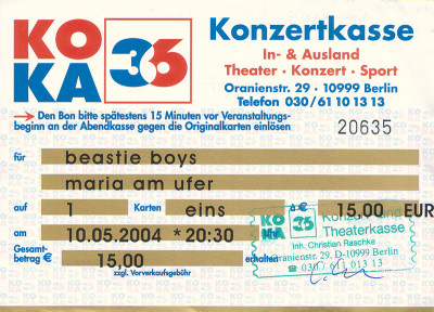 On Monday, we arrived at the 'Maria am Ufer' at 7 pm. It is situated on the river Spree that used to separate East from West Berlin just there. The club is I think the basement for a skyscraper-to-be that has never been built. The security was really strict and thorough. Mobile phones had to be left in the entrance area. After showing your ID you got a wristband and were allowed to enter. Inside there was a wired DJ playing a strange mix of music (Tom Waits followed by N.E.R.D.) and on the walls the covers of Beastie Boys' records were projected and on TV sets the music videos were shown without sound. The starting time should have been 8:30, but I think they started at about 9 pm. The club was well filled, as I said about 400 tix for fans and a sound technician told me about a guest list of 200 names, but only half of them showed up. Very basic and small stage, no light show (I know about lighting), just the pure basic house lights and obviously no one to care about the programming. Mix Master Mike stepped on the stage, had an incredible mix intro, and then the boys came too and began to perform "Root Down."
